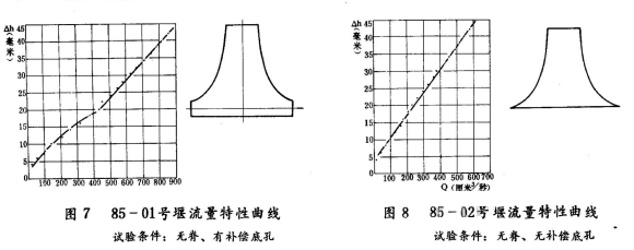 用85-01號和85-02號兩種雙曲線薄壁堰,在試驗水槽端安裝成無脊有補(bǔ)償孔和無補(bǔ)償孔兩種情況,進(jìn)行了多次實驗,所得數(shù)據(jù)通過整理,畫出流量特性曲線,見圖7和圖8。