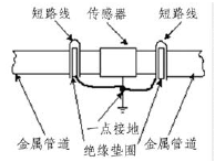 由于污水處理流量計的測量感應(yīng)電壓很小,電壓較低,易受外界電磁噪聲的影響,故在安裝時應(yīng)進(jìn)行可靠的接地連(跨)接。金屬管道污水處理流量計接地連(跨)接方法如圖3所示。