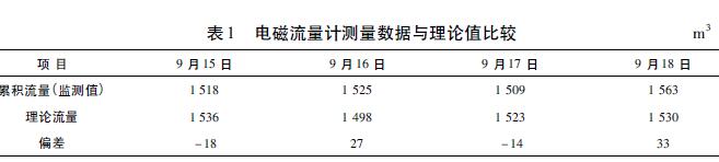 電磁流量計與V錐流量計都適用于環(huán)境較惡劣的場合。在測量精度上,V錐流量計要比電磁流量計高,而且安裝更靈活,對上、下游直管段的要求很短,但V錐流量計要比電磁流量計昂貴得多。電磁流量計的測量精度雖不及V錐流量計,但在此應(yīng)用中完全可以滿足要求,而且運行穩(wěn)定性和流量數(shù)據(jù)準(zhǔn)確度也很好。表1是使用電磁流量計對園區(qū)某個企業(yè)監(jiān)測點連續(xù)4天的累積流量監(jiān)測數(shù)據(jù)與理論流量的對比。