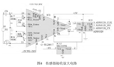 IC2(SL28617)放大器用于放大傳感器送來)放大器用于放大傳感器送來的反映流量大小的電壓信號,圖中的反映流量大小的電壓信號,圖中Rin和Rfb是用來改變運算放大器增益的電阻。來改變運算放大器增益的電阻。S1是勵磁信號源,R17、R18是輸入偏置電阻,運放的是輸入偏置電阻,運放的9腳和16腳分別接電源±腳分別接電源±5V,接在運放IC2輸出端的IC3(ADS8320 ADS8320)是16位高速A/D轉(zhuǎn)換器,其轉(zhuǎn)換速度可達(dá)16kHz/s,接在接收放大器與接在接收放大器與A/D轉(zhuǎn)換器之間的IC12(ISL21090 ISL21090)是三端穩(wěn)壓器。電路如圖)是三端穩(wěn)壓器。電路如圖4所示。