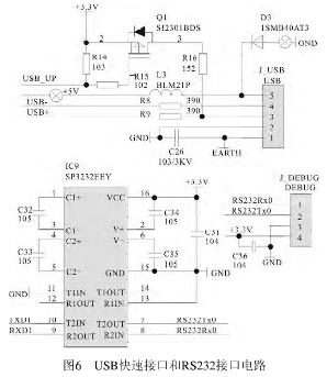 由Q1、R14、R15、R16、L3、D3、R8和R9等元件組成的電路與單片機對應(yīng)電路,組成等元件組成的電路與單片機對應(yīng)電路,組成USB快速接口電路。快速接口電路。IC9(SP3232EEY)芯片與周圍元)芯片與周圍元件組成RS232接口電路。電路如圖6所示。
