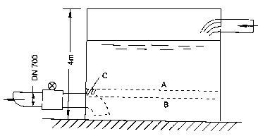 案例4 廣西某水廠在郊區(qū)山頭設(shè)置清水池,利用水池高度勢能發(fā)送成品水。運(yùn)行人員反映計(jì)量出水量的DN700mm酸堿污水流量計(jì)有時(shí)候流量顯示不穩(wěn)?;蝿?dòng)達(dá)百分之十幾到百分之二十,誤差也大,估計(jì)相差約20%?,F(xiàn)場考查發(fā)現(xiàn)水池如圖7-9所示安裝流量傳感器,水位高度不足就會卷入氣泡,甚至流量傳感器測量管內(nèi)不能充滿。如水位降至A線時(shí),雖高出吸入口頂端,但高出不多,還會在C處產(chǎn)生旋渦,將水位表面空氣卷入形成氣泡,使顯示晃動(dòng);若水位降到B,測量管將不滿管。我們建議如圖虛線所示裝一彎頭,擴(kuò)大水池有效容量,減少吸入氣泡的機(jī)會,彌補(bǔ)原設(shè)計(jì)的不足。這類實(shí)例是經(jīng)常遇到的。